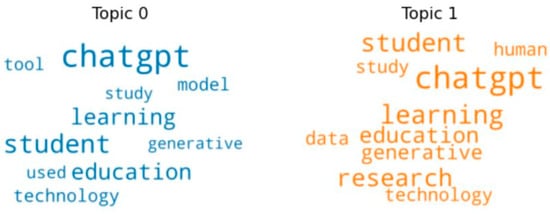 Table 5 demonstrates the assignment of themes to each topic based on the dominant keywords within that topic. Topic 0 is characterized as “Generative AI Tools and Their Pedagogical Integration in Higher Education”, shaped by the prevalence of terms such as ChatGPT, education, generative student, learning, and tool. Topic 1 is defined as “Generative AI in Higher Education Research and Ethical Implications”, driven by the frequent appearance of keywords such as research, data, human, generative, and ChatGPT.