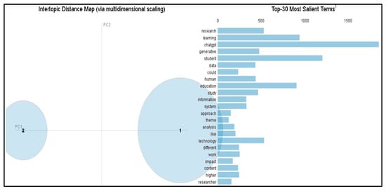 In this study, LDA was employed to supplement the results generated through Biblioshiny and VOSviewer, providing an additional layer of topic modelling that deepens the interpretation of literature on AI in higher education. The LDA topic modelling analysis was conducted in Python (version 3.9.7) using the Gensim library (version 4.2.0). While VOSviewer mapped keyword co-occurrences to show term relationships and Biblioshiny identified the most-cited references, LDA offered a topic-based perspective, grouping frequently co-occurring words into dominant themes prevalent in the literature [75]. The LDA algorithm works by identifying clusters or patterns of words and phrases that frequently appear across research articles [76,77]. These clusters are then used to generate a set of topics from the textual data that illustrate underlying themes within the literature [53,76]. By assigning weights to the dominant terms within each topic, LDA automatically detects and structures key themes across the documents, thereby allowing for a more nuanced understanding of the dataset [54]. The outcomes of this topic modelling process can then be visualized to depict patterns, correlations, and trends in the literature, offering insights that might not have been visible through traditional manual literature review processes [78,79].