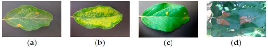 As shown in Figure 1, there are many kinds of crop diseases that are identified based on plant leaves. Approximately 38 kinds of diseases are represented with one sample for each. More details of the dataset can be found in [40]. As illustrated in Figure 2, there are four types of diseases in apple crops. Figure 2a shows a leaf infected with leaf spot disease (Alternaria mali) while Figure 2b depicts mosaic disease (Apple mosaic virus). Similarly, Figure 2c,d show rust (Gymnosporangium juniperi-virginianae) and brown spot (Septoria rubi) diseases, respectively, in apple leaves.