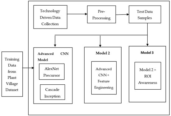 We proposed a framework called the Automated Agricultural Crop Disease Identification System (AACDIS) to assist in crop disease identification. The framework illustrated in Figure 3 represents a technology-driven approach to precision agriculture. It is based on deep learning techniques and incorporates three models for automatic detection of crop diseases. The system was designed to work with any crop disease for which training data is available in the PlantVillage [40] dataset. The framework acquires plant leaf images from target crops through IoT-based data collection. Training data from the dataset are used to train the deep learning models, with an option to utilize pre-trained models as well. The input image, also referred to as the test image, undergoes preprocessing, during which filters are applied to enhance image quality. Subsequently, the system performs automatic disease detection and classification using one of the models. The first model, referred to as the advanced CNN model, leverages the AlexNet architecture and a cascade inception module to enhance prediction performance. Compared with baseline CNN, this model demonstrated greater efficiency and improved accuracy in disease prediction.