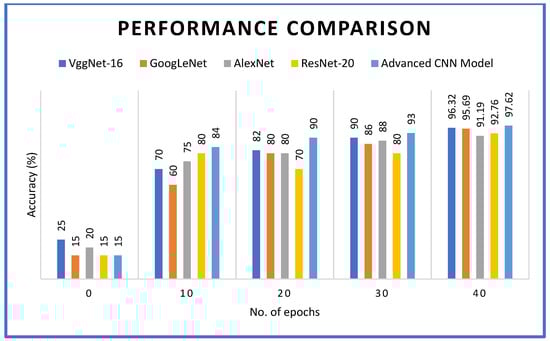 The proposed advanced CNN model, as presented in Figure 6, was compared with several other existing deep learning models. The convergence process was evaluated in terms of accuracy as the number of epochs increased. The number of epochs used for experiments is 40. After reaching 40 epochs, the VggNet-16 model achieved an accuracy of 96.32%, GooLeNet reached 95.69%, AlexNet reached 91.19%, and ResNet-20 achieved 92.76%. In comparison, the proposed advanced CNN model demonstrated the highest accuracy of 97.62%. These results are consistent with the findings of [44], which indicated that custom CNN architectures outperform generic models for crop disease diagnosis, particularly when cascade inception is integrated with AlexNet-based architectures. The 100% mosaic identification accuracy supports the observation of [57] that fungal manifestations are generally less distinct than viral patterns.