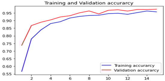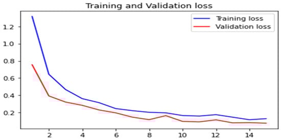 In Figure 16, the training and validation accuracy are presented, while Figure 17 shows the training loss and validation loss. The results revealed that the proposed model 2 has acceptable performance in terms of accuracy along with minimal loss.
