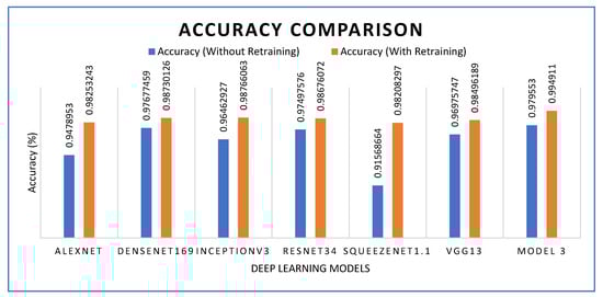 As presented in Figure 23, the proposed model 3 was compared with several deep learning models. The results were analyzed with and without transfer learning. It was observed that experiments incorporating transfer learning demonstrated better performance. With and without transfer learning, respectively, AlexNet achieved 94.78% and 98.25%, DenseNet169 achieved 97.67% and 98.73%, Inception V3 96.46% and 98.76%, ResNet34 97.49% and 98.67%, Squeezenet1.1 achieved 91.56% and 98.205 while VGG13 achieved 96.97% and 98.49%. The proposed model 3 exhibited the highest performance, achieving 97.95% without transfer learning and 99.48% with transfer learning.