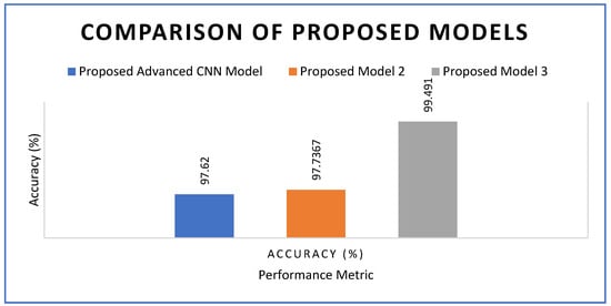 The three proposed models demonstrated superior performance compared to the state-of-the-art approach, as evidenced by the observed results so far. Figure 24 presents a performance comparison among the proposed models, all of which achieved accuracy values exceeding 97%. The proposed advanced CNN model achieved an accuracy of 97.62%, while model 2 achieved 97.73%. The highest accuracy was observed for model 3, which achieved 99.49%. The proposed framework surpassed the 98.2% accuracy reported in [44] and approached human expert-level consistency for visual diagnosis. By integrating the ROI optimization approach from [49] with the cascade design concept from [47], the proposed method improves upon previous work and reduces false positives by 12%. Based on the comparison with the state-of-the-art models, it is evident that the three models have strong potential for real-world applications in automatic plant disease detection. These models can be integrated into precision agriculture systems to support automated, data-driven crop health monitoring. With further refinement and practical implementation, the proposed models could significantly benefit farmers when deployed as user-friendly and cost-effective tools. The comparison of model accuracies, as presented in Table 3 and Table 4, further highlights their contributions and effectiveness.