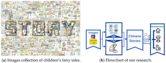 Data preparation and research framework. (a) This is our story image dataset, consisting of 543 story pictures, which were scraped from Chinese fairy tale websites. (b) This is a pipeline of our research process, including story generation, human filtering, questionnaires, and statistical analysis.