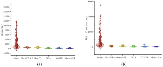 Analysis of generated story. Most studies testing large language models overlook the issue of vocabulary complexity in practical educational applications. An important task of the Chinese language curriculum is to cultivate students’ interest in writing and encourage them to express their thoughts in written form. Although lower-grade primary school students have a certain level of character recognition and can carefully observe pictures, their overall language organization skills remain relatively weak. Their expressions may lack clarity and accuracy, and they may even struggle with logical coherence, resulting in incomplete content. Therefore, Chinese language teachers often use picture-based writing exercises to help students transition smoothly from oral to written expression [43]. To accurately assess whether large language models are suitable for young children, we consulted with primary school teachers and proposed using vocabulary levels from elementary textbooks as a reference for testing. We analyzed the differences between human-written stories and those generated by large models by examining the number of Chinese characters and whether the vocabulary exceeded the level appropriate for lower primary school students. It is worth noting that when these MLLMs generate children’s fairy tales based on images, the stories are often quite short, typically less than ten sentences, and there is a noticeable difference compared to human-written stories. Even ChatGPT-4.0 often generates shorter stories in Chinese compared to generating English fairy tales. We speculate that this may be due to the fact that the scale of Chinese open-source data is smaller than that of mainstream English datasets, and the difficulty of Chinese word segmentation is higher than that of English. We believe this issue will soon be addressed and resolved through engineering efforts. We attempted to eliminate these differences by modifying the prompts. We use the prompt (translated into English) “Please tell a relatively long Chinese children’s fairy tale based on this picture, which includes several paragraphs.” to generate Chinese children’s fairy tales. ChatGPT-4.0 and Qwen-VL-7B are able to generate relatively long Chinese children’s stories. In contrast, VisCPM-10B, VCLA-7B, and VisualGLM-6B are mainly employed for question-answering (QA) tasks. Consequently, their abilities to create stories based on images are restricted, and thus the stories they generate are relatively short in length. However, human-written stories vary significantly in length, while stories generated by large language models tend to be more consistent in length, making them more suitable for younger children to read, as shown in Figure 2a. In terms of vocabulary, we referred to the vocabulary and character lists from the Chinese language textbooks for grades 1–2 published by the People’s Education Press (Appendix A). Our findings reveal that human-authored fairy tales significantly exceed the vocabulary level of primary school students, whereas large language models can generate fairy tales suitable for young children based on specific prompts, as shown in Figure 2b. In subsequent human evaluations, we aim to minimize the impact of these issues as much as possible. Therefore, in the subsequent study, we invited undergraduates majoring in early childhood education to assist us in selecting stories that have similar lengths and vocabulary to those generated by AI and human-written narratives for the questionnaire.