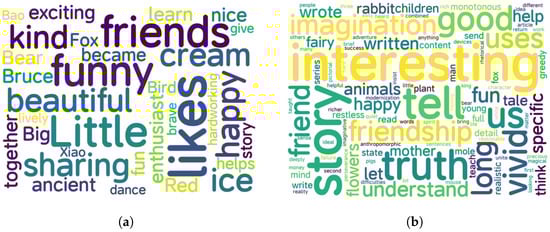 Word cloud analysis of reasons for the favorite story given by elementary students. (a) Reasons for first-grade students’ favorite story. (b) Reasons for second-grade students’ favorite story.