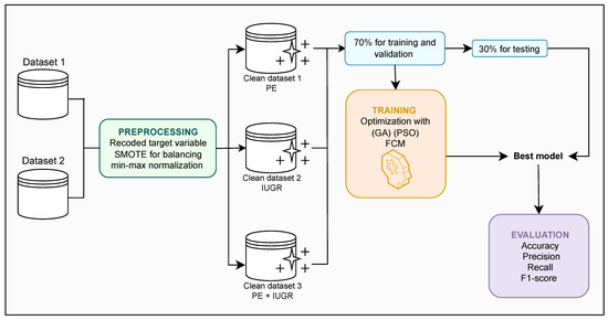 In this section, we describe the methodology used to implement FCM optimized with metaheuristic algorithms (see Figure 1). First, we describe the data sets and their preprocessing. Next, we present the modeling techniques and their experimental configuration. Finally, we describe the metrics used to evaluate the performance of the models.