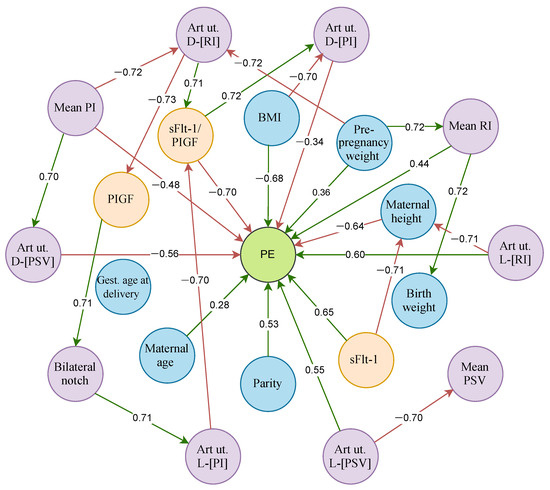 Figure 2 shows the design of the FCM optimized with PSO, which prioritizes interactions with higher weights representing predictive causal links, where blue circles indicate maternal and fetal characteristics, orange circles are biochemical markers, and purple circles are characteristics of uterine Doppler ultrasound. In addition, the green lines represent relationships with activating influence and the red lines represent inhibitory relationships. Overall, the FCM-PSO model allows the functionality of the system to be described by representing the concepts and their relationships, making visible how the process towards PE prediction is organized. When analyzing the relationships, it was identified that the sFlt-1/PlGF node (−0.70) acted as the factor with the greatest inhibitory influence, followed by BMI (−0.68) and maternal height (−0.64). On the other hand, the sFlt-1 marker (0.65) showed an activating influence. This behavior could be explained by considering that PlGF, produced by the syncytiotrophoblast, promotes angiogenesis and vascular homeostasis, while sFlt-1 is a protein that antagonizes PlGF and vascular endothelial growth factor in circulation, leading to endothelial dysfunction. sFlt-1 is released from the trophoblast in response to various triggers, such as hypoxia and oxidative stress [54,55]. In placental dysfunction, lower levels of PlGF and higher levels of sFlt-1 are observed, and their increase has been associated with hypertensive disorders, as well as with their severity [56].