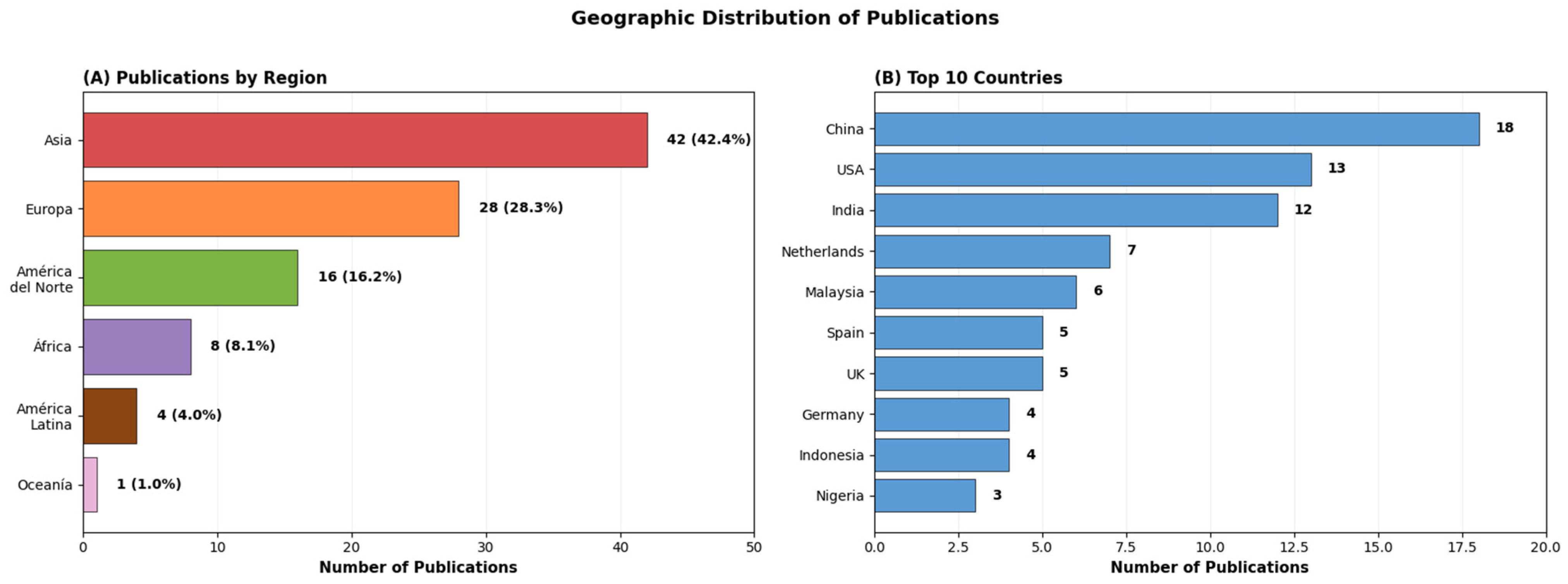 | Asia | 57 | 57.6% | India (28), China (12), Malaysia (4), Indonesia (3), Pakistan (2), Saudi Arabia (2) |