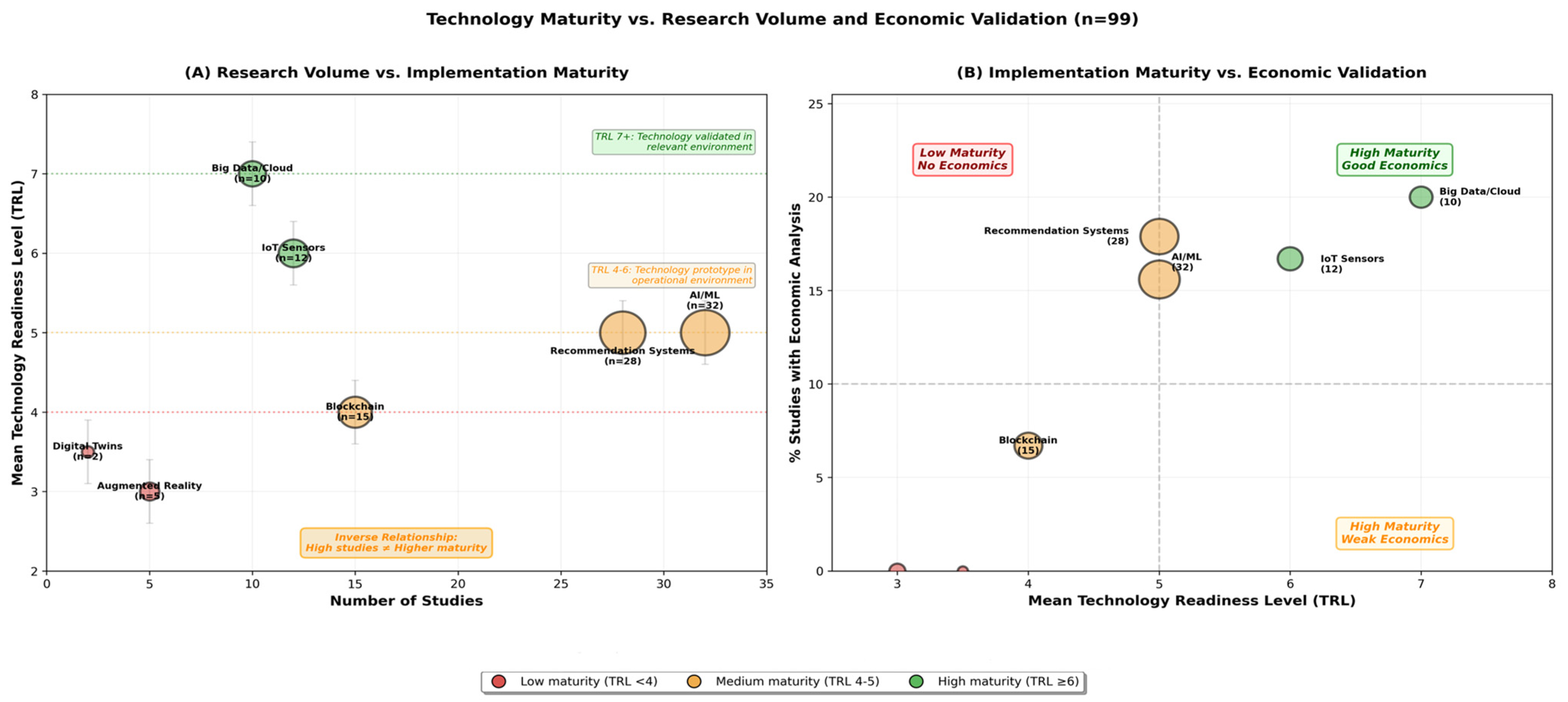 - Implementation–Maturity Matrix, linking Technology Readiness Levels (TRLs) with validation evidence and field deployment duration.