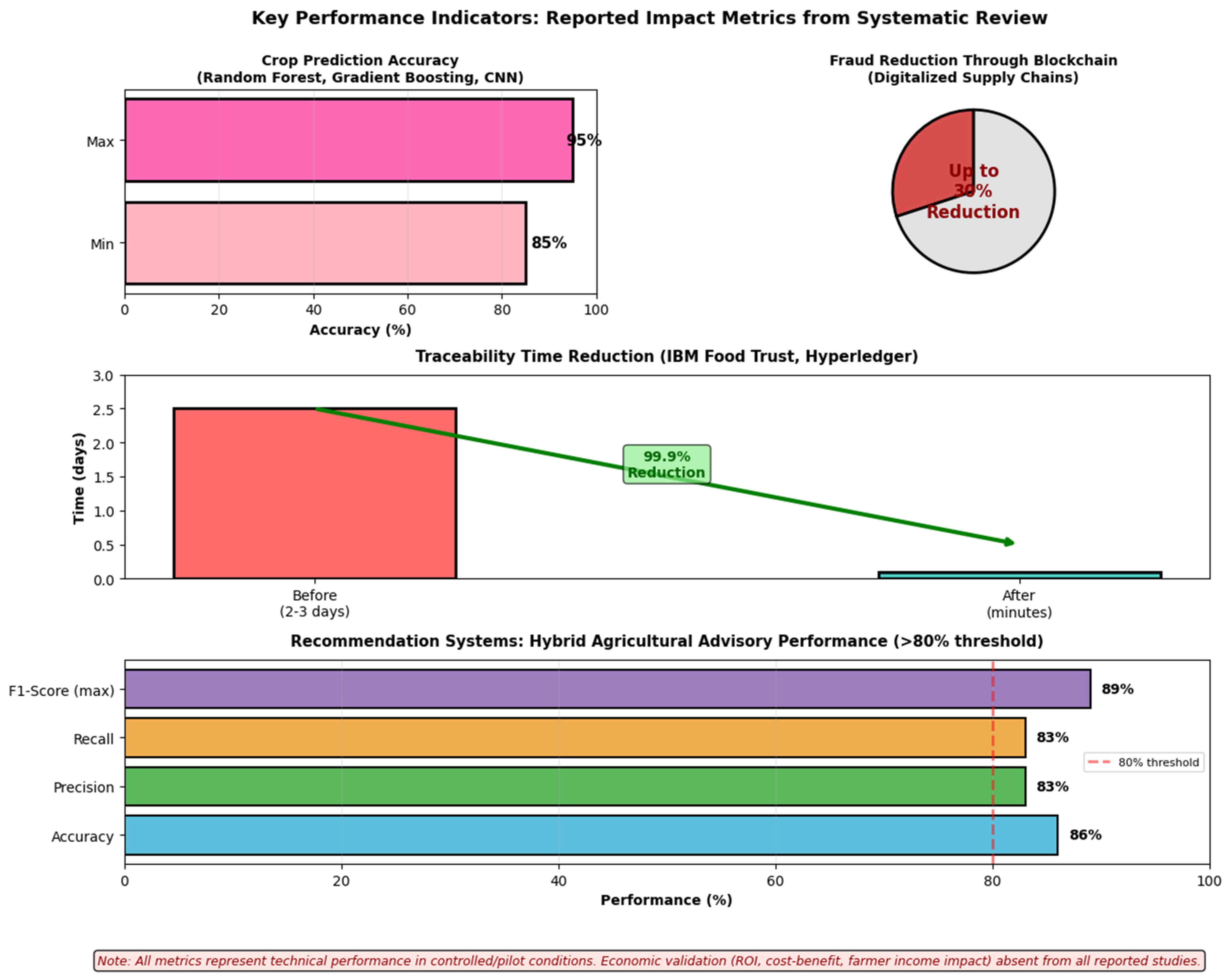| Recommendation systems | 28 | Precision, recall, MAE, F1-score | Accuracy 80–92%; F1-score 0.78–0.89 | Crop, fertilizer, and e-commerce recommendations |