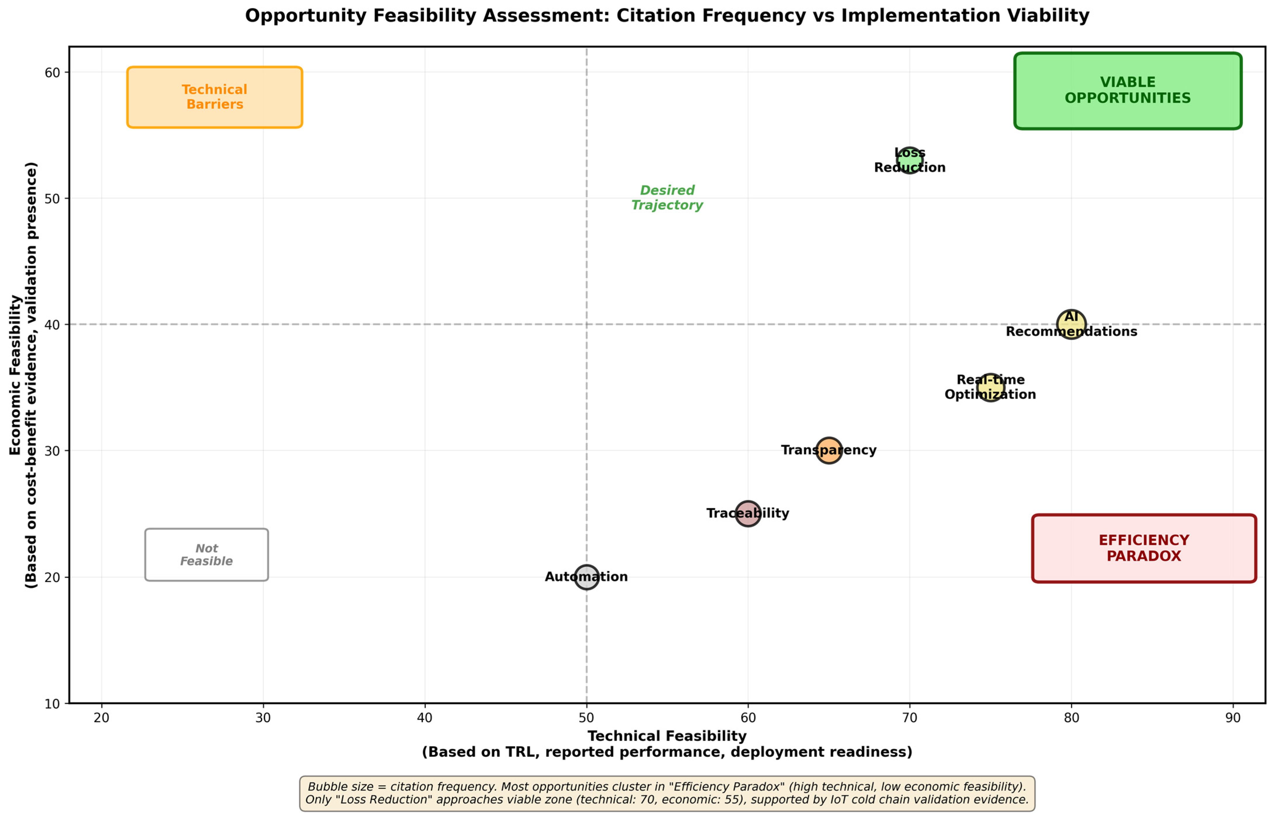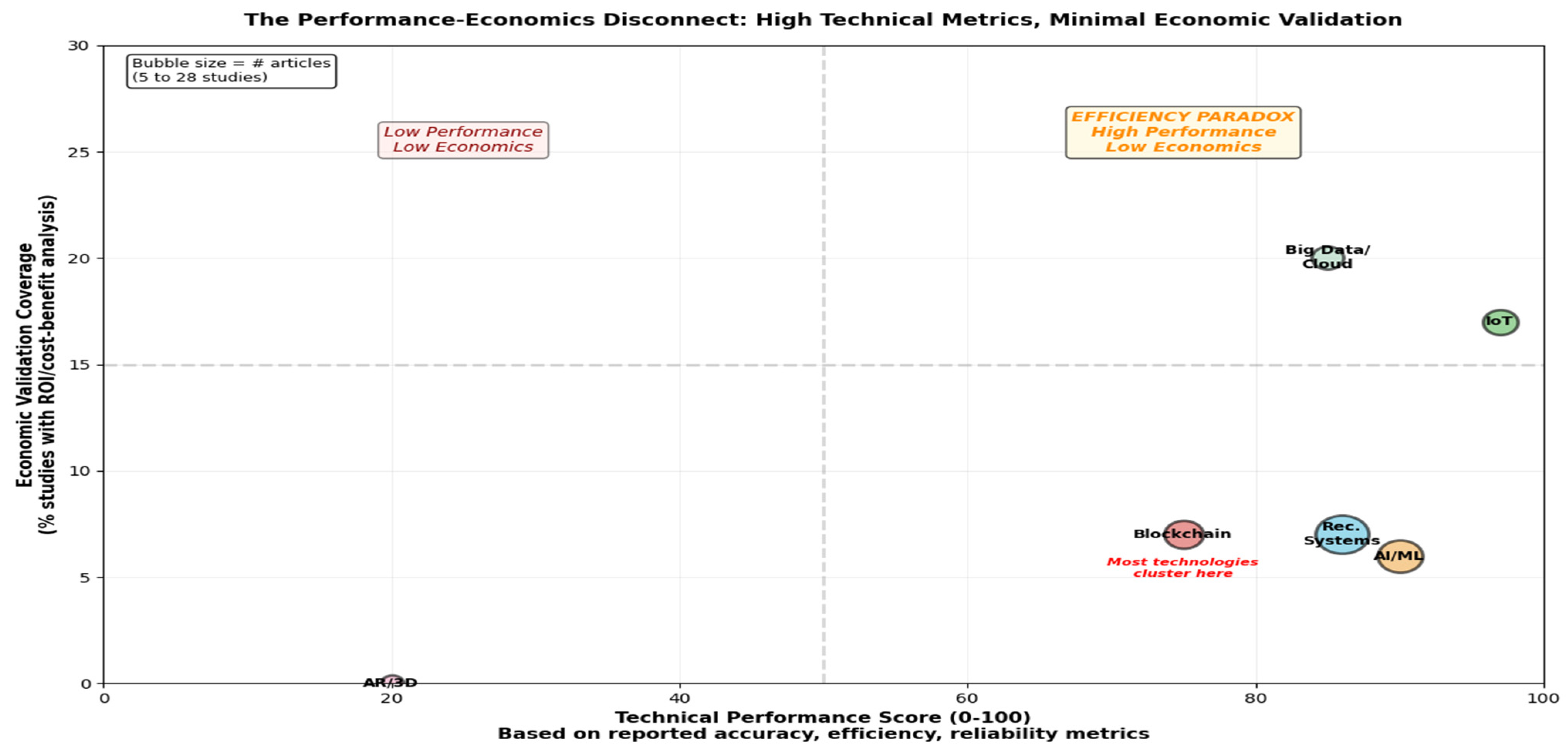 - A comparative matrix plotted TRL level vs. presence/absence of economic validation, operationalizing the “efficiency paradox”: high technical performance coupled with limited deployment viability.