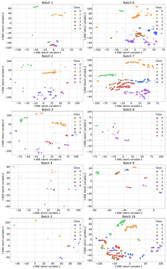 Visualization of sensor drift in the feature space of the ten batches of data with t-SNE. Classes: 0—ethanol; 1—ethylene; 2—ammonia; 3—acetaldehyde; 4—acetone; 5—toluene.