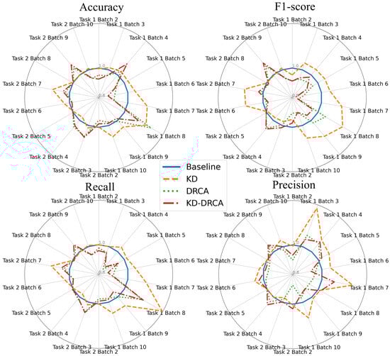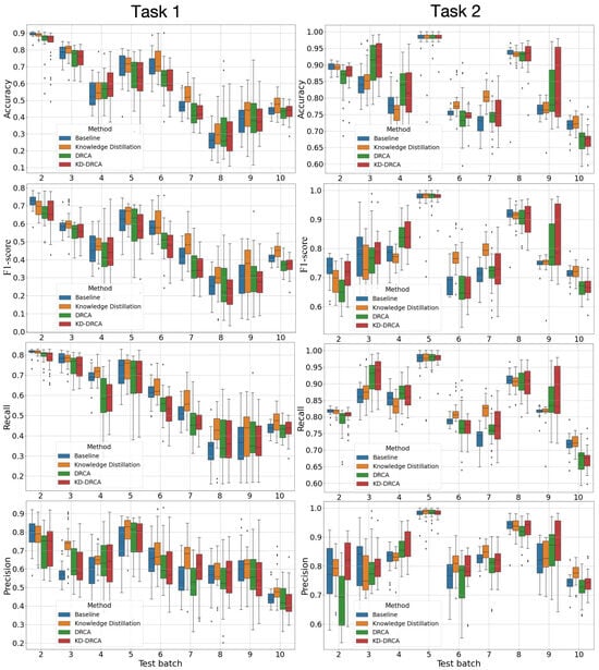 Classification performance of the baseline, KD, DRCA, and KD–DRCA methods on the test sets of different data batches. Task 1: Train on the first batch and test on the remaining batches; Task 2: Train on all previous batches and test on the next batch.