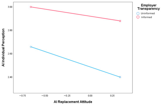 Hypothesis 6 examined whether employer transparency moderated the impact of replacement attitude on individual perception, while controlling for age, gender, and education. In the linear moderation analysis, replacement attitude had a negative effect on AI perception (β = −0.26, p < 0.001), whereas employer transparency had a strong positive effect (β = 0.43, p < 0.001). This signifies that replacement attitude predicts a negative perception of AI among individuals, and, in contrast, being informed about AI use in the workplace predicts a positive perception. The interaction was significant (β = 0.14, p < 0.001); employer transparency positively moderated the negative relationship between replacement attitude and AI perception. This indicated that the negative impact of replacement attitude was attenuated by transparency and confirmed H6. Specifically, for uninformed respondents, the attitude–perception slope was β = −0.26 (p < 0.001), whereas for informed respondents it was only β = −0.12 (p < 0.001). This implies that being informed about AI use lowers the levels of replacement attitude among individuals and its translation into a negative perception. This interaction is illustrated in Figure 3.