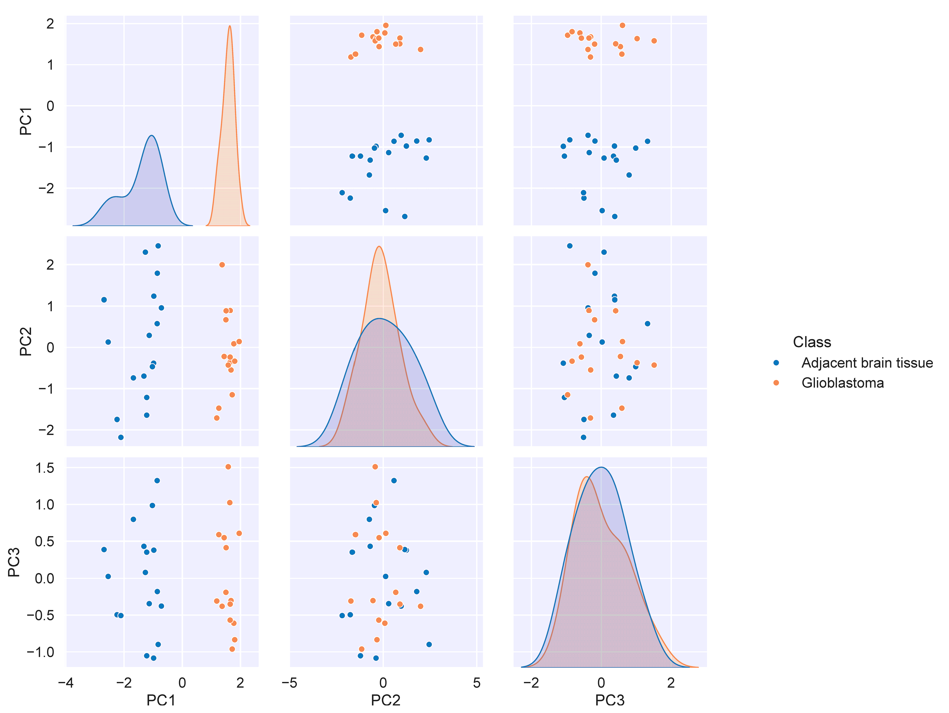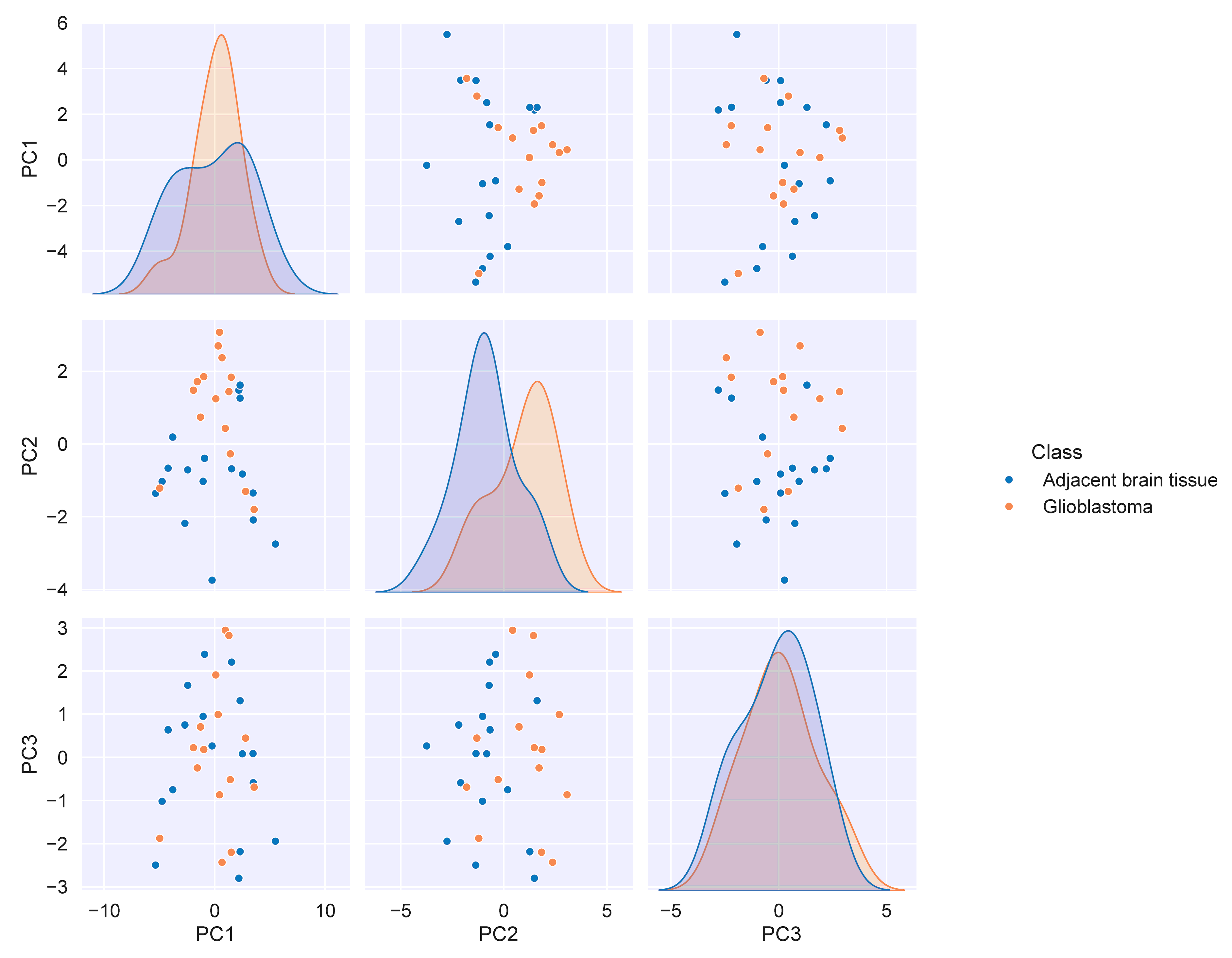 The study demonstrated that the application of the denoising autoencoder with an attention mechanism effectively reduces the dimensionality of metabolomic data. In the case of analyzing metabolomic data with 446 features, the DAE with the attention mechanism enabled vector representations of 30 features. The obtained vector representations revealed a structure allowing linear separation of groups (glioblastoma and adjacent tissue). However, these vector representations require additional analysis for interpretation. To address the task of obtaining interpretable features, the AIMarkerFinder method, based on the DAE with an attention mechanism, was employed. This method selected 4 metabolites (Malonyl-CoA, Glycerophosphocholine, SM(d18:1/22:0 OH), and GC(18:1/24:1)) from the 446 features.