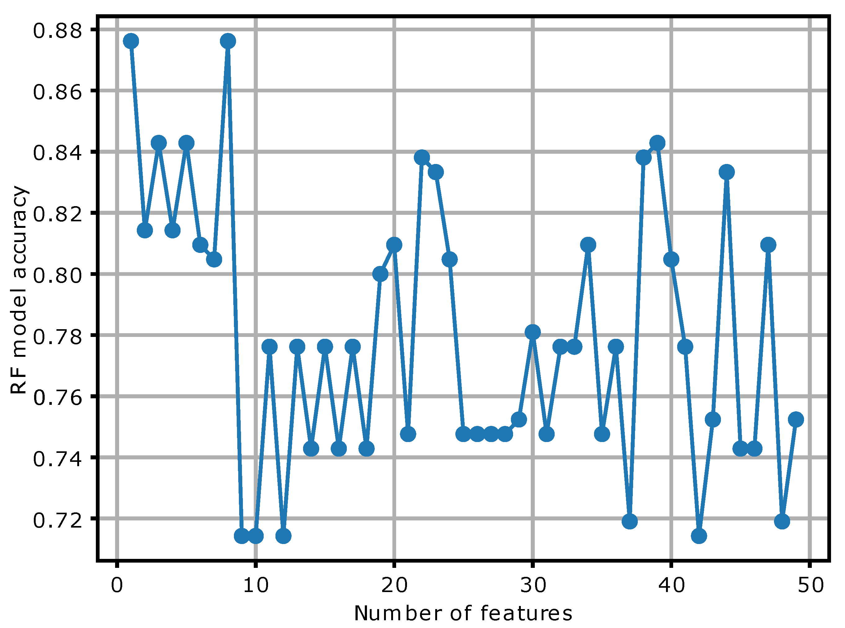 Therefore, this model was selected for comparison with AIMarkerFinder. The results of the analysis of the dependence of the RF model classification accuracy on the number of features selected by the Recursive Feature Elimination (RFE) method on the metabolomic profile dataset are presented in