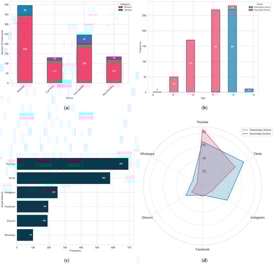 Chart showing the number of participants by school level and most used social networks: (a) Number of participants per school (Students and Teachers). (b) Age distribution of students by educational level. (c) Most used social networks by frequency. (d) Most used social networks by educational level.