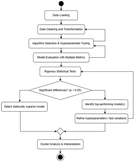 To ensure that the selection of the final model was supported by statistical evidence, a validation phase was implemented. Within this group, the models were ranked according to their performance on the three evaluation metrics. The Davies–Bouldin score was inverted to standardize the ranking, ensuring that a higher score always indicates better performance. The Friedman test was then applied to determine statistically significant differences between the models. When these differences were confirmed (p-value < 0.05), Nemenyi’s post hoc test performed pairwise comparisons. This final step made it possible to precisely identify which model performed significantly better than the others, thus validating its final selection. If no significant differences are found (p-value ≥ 0.05), the process identifies the top-performing model(s) based on the average ranking across metrics and refines them further by conducting additional targeted tests on that specific algorithm—such as expanding its hyperparameter grid, testing variations in the number of clusters, or incorporating hybrid approaches—before reapplying the statistical tests to confirm superiority. Additionally, if a change in algorithm is proposed, a feedback loop returns to the data cleaning and transformation phase to adjust for any new transformations required. If the model evaluation yields very low metrics, another feedback loop adjusts the hyperparameters by returning to the algorithm selection and hyperparameter tuning phase.