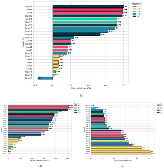 The results show that Hierarchical Clustering (HC) in the Mod21 configuration achieved the best overall performance, with an average rank of 3.33. K-Means, in the Mod1 and Mod2 configurations, followed closely, both obtaining an average rank of 3.83. In fourth place was Mean Shift (Mod11) with 4.67, and in fifth place HC (Mod20) with 5.33. The average rank values derive from the Friedman test, which assigns ranks to each configuration based on the evaluated metrics-lower ranks indicating better overall performance. The Nemenyi post hoc test further confirmed that the first three configurations (Mod21, Mod1, and Mod2) are significantly superior (p < 0.01) to the lower-performing ones, reinforcing the robustness of the hierarchical and K-Means approaches. Full comparative results for all 24 configurations are presented in Table 3.