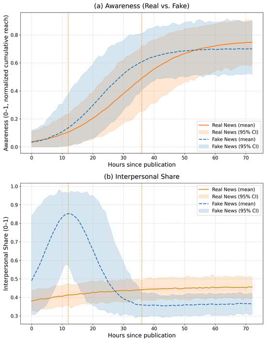 - The interpersonal propagation share in fake news rises first and then recedes, whereas real news remains overall more stable;