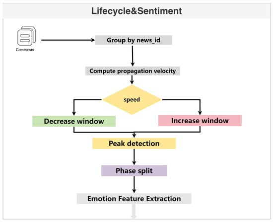 Propagation rate is the core indicator of diffusion speed and directly determines the accuracy of phase boundaries. Fixed-size windows are prone to bias during the burst stage (dense interactions) and the decay stage (sparse interactions). We therefore adopt a sliding window with adaptive window length, designed as follows [21]. The adaptive segmentation pipeline is illustrated in Figure 3.