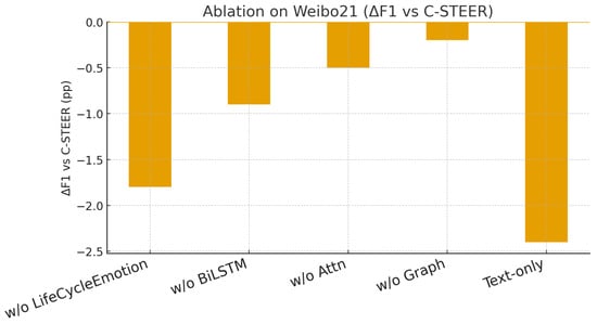 Life-cycle emotions vs. global statistics: Relative to global aggregation, LifeCycle-Emotion improves F1-macro by 1.3 percentage points (p < 0.01). This provides strong evidence that partitioning propagation into initiation–burst–decay enables the model to capture stage-specific emotional signatures aligned with distinct phases of user adoption and interaction—critical dynamics that a global view entirely overlooks [9,20,26].