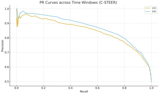 Figure 8 compares Precision–Recall (PR) profiles at 12 h and 24 h. The 24 h curve consistently dominates the 12 h curve, implying fewer false positives at matched recall. For recall-oriented monitoring (e.g., target recall ≈ 0.80–0.90), the 12 h window remains competitive with only a modest precision drop; thus, we first select a target recall per scenario from the PR curve and then set the operating threshold accordingly.