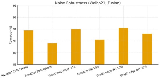We inject noise by deleting tokens at 10% and 30%, applying timestamp jitter of ±1 h, flipping 10% of emotion labels, and deleting graph edges at 10% and 30% (Table 12).