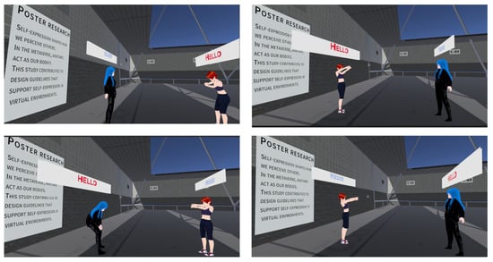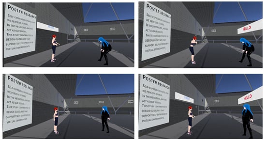 Avatar-focused control conditions used in the experiment. These screens illustrate the appearance-only baseline in which no experimental speech-balloon text manipulation was introduced. Any constant platform UI elements visible in the scene were not evaluated. These screenshots are illustrative examples of the experimental conditions; minor overlaps or partial occlusions of avatars and UI elements do not affect the operational definition of the conditions or the interpretation of the experimental results.