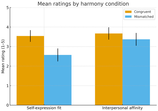 Mean ratings of self-expression fit and interpersonal affinity by harmony condition. Error bars represent 95% confidence intervals. Congruent conditions yielded significantly higher scores than mismatched conditions, supporting H1.