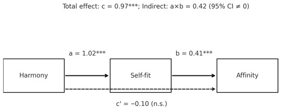 Mediation model depicting the relationship between harmony, self-expression fit, and interpersonal affinity. Solid arrows indicate significant standardized paths (, , *** ), whereas the dashed arrow indicates a non-significant direct path (, n.s.). The total effect was , and the indirect effect was significant (bootstrap 95% CI excluded zero), confirming H2.