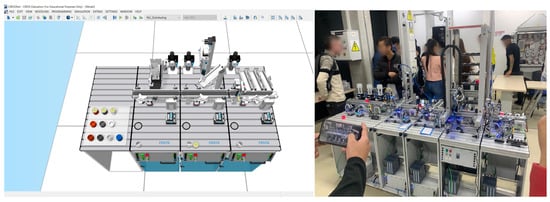 This case study was implemented in an Automation course of the fifth semester, whose aim was for students to understand and analyze logic circuits in industrial automation, using PLCs as control units for basic automation processes, and understand the development of algorithms in the Ladder and AWL languages. For that, a FESTO Modular Production System (MPS) 400 [38,39] was used in conjunction with FESTO CIROS software v7.1 [40], which recreates a digital twin for the MPS components and stations. A digital twin is a mirror image that matches the operation of the physical process in real time [41]. Figure 3 depicts the MPS and CIROS software utilized by students.