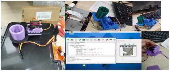 With the previous procedure, students learned CAD and modeling for the mentioned mechanisms, but they also put into practice their designs, testing and controlling them by employing the Single-Board Computer (SBC) Raspberry Pi [42]. An SBC is a small computer whose main components, for example, the processor and memory, are integrated into a single system on a chip, allowing the students to interact with hardware elements such as sensors or actuators in applications that encompass computing, robotics, or machine learning [43]. In this way, students implemented control routines for stepper and servo motors, as well as algorithms for object detection in Python v3.13. As a final course challenge, they designed and implemented an automatic electromechanical classification system that, depending on the object detected, puts the object in a specific position. The challenge included well-known computer vision packages such as OpenCV, TensorFlow, and TeachableMachine [44,45]. This last package simplifies the training of machine learning models through a custom dataset (object images). In the challenge, two objects were detected and positioned. Figure 4 shows several designs made by the students and the implementation of the machine learning program in the challenge. This case study was deployed in 2025.