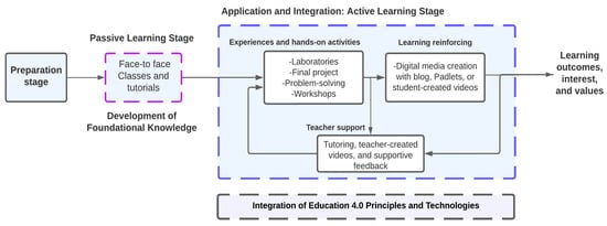 The framework in Figure 5 is divided into passive and active learning stages. In the passive learning stage, students take their classes, understanding and remembering information about the courses, aligned with the main course objectives reported in Table 1. Afterward, to apply and integrate the foundational knowledge, students move towards an active learning stage, where they interact through hands-on activities in laboratories, a final project or challenge proposed in each course, and workshops. In these learning spaces and activities, students developed discipline-based and problem-based skills and soft skills, such as collaboration, engagement, and communication. In addition, in several courses, students were asked to construct digital media through resources such as blogs, student-created videos, and Padlets. Concerning student-created videos in assignments, laboratory reports, and even exams, students had to explain how they created a specific design with the tools and technologies in the course, i.e., a circuit, a program, a 3D model, an automation sequence, etc. The duration of these videos did not exceed 5 min. In other courses, for instance, students posted the responses to diverse activities using Padlets. A Padlet is an online and real-time collaborative visual tool that allows students and teachers to share various types of digital media, including text, images, links, videos, and documents [46]. Prior activities reinforced students’ learning in the courses (cases).