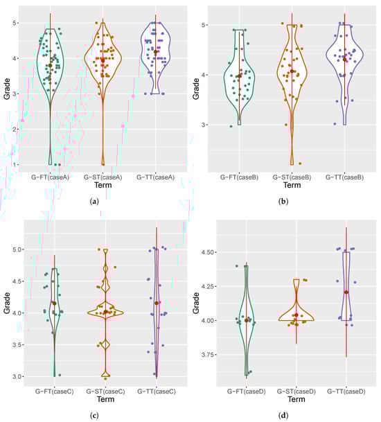 Progression of students’ grades according to each case study (a–d), respectively. FT (First Term), ST (Second Term), and TT (Third Term). Red point highlighted (mean) for each term. Grades in the range of 0–5.