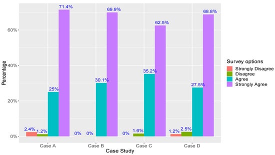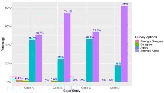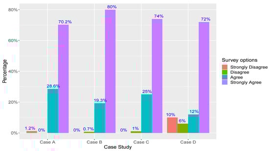 For each category in this survey, because of the number of participants and responses, McDonald’s omega coefficient () was used instead of the traditional Cronbach’s alpha () to test the internal consistency of the instrument (survey). Table 4 shows the results for the () coefficient in each category and case study. McDonald’s omega coefficient () is a well-known statistical alternative to Cronbach’s alpha () based on factorial loads and is more suitable when the number of options of the survey is fewer than that of the traditional five-point Likert scale, or when the number of respondents is low [55]. As (), a value equal to or over 0.7 demonstrates good reliability of the instrument in its categories. The percentage of respondents was 84%, 87.5%, 72.72%, and 66.66% for each case study, respectively.