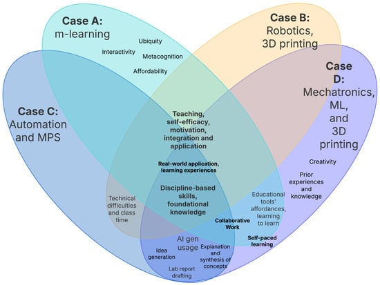 Students in Cases A and D reported that collaborative work was fostered in the methodology. Nevertheless, in other cases, for instance, Case A, this was not explored since students could experiment directly from their homes. This suggests that certain technologies could promote or hinder collaborative learning in classrooms, even when this is encouraged by the teacher. So, in Case C, the digital twin integration and the technical issues derived from this employment could have hindered the link between collaboration, learning, and motivation; conversely, in Case D, the usage of 3D printing fostered collaboration, cognitive, and affective learning outcomes. Particularly, in Case C, the affordability and performance of the technologies used (digital twin) had an influence on academic performance and affective learning outcomes, which is consistent with prior studies on technology usability [75], and technological self-efficacy [62]. In Case D, the creation of physical artifacts through 3D printing allowed students to put forward their creativity and skills developed in the course, which is consistent with prior studies on robotics and physical computing as catalysts for learning and engagement [34,76].