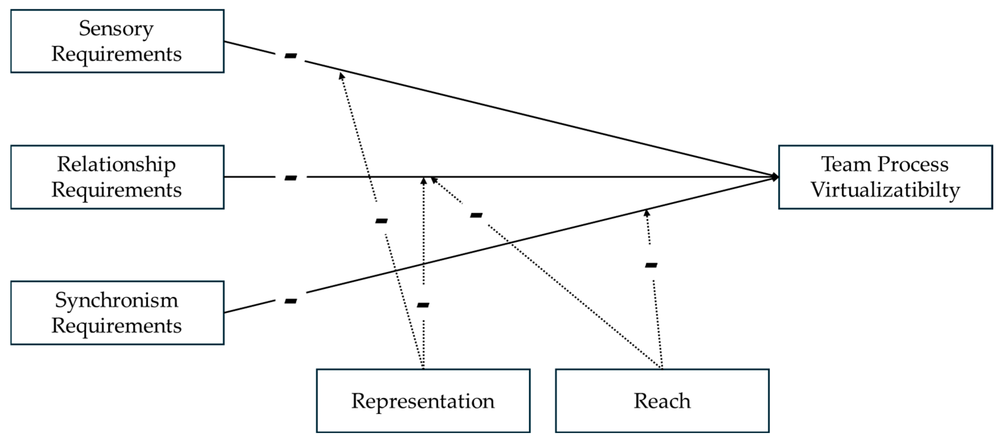 Therefore, these concepts (reach and representation) were not moderators; they do, however, have a direct impact on the ease of virtualizing team processes. It is worth noting that the model proposed by Overby [