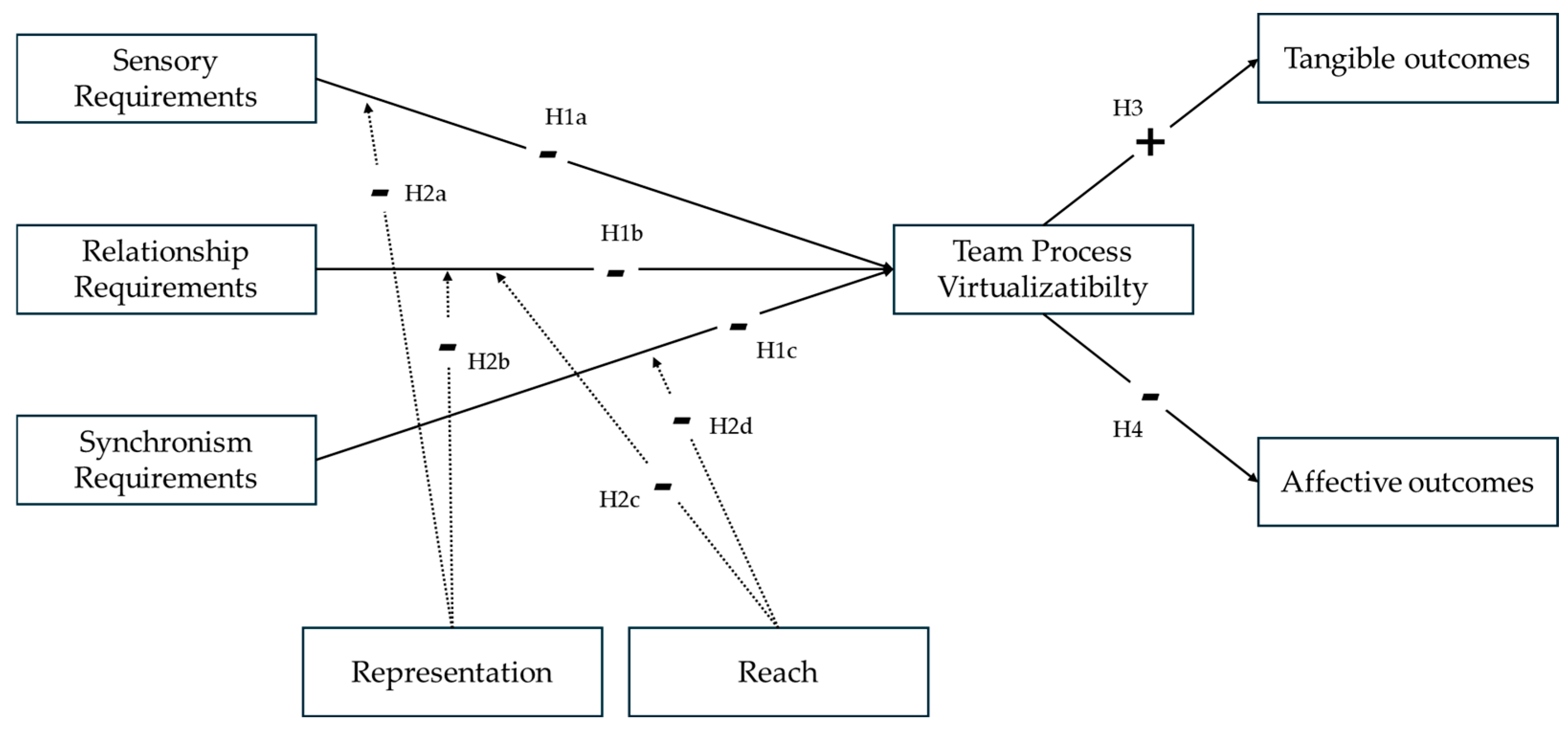 18], technology cannot provide adequate social and contextual information to match the richness of face-to-face communication, which can hinder the amenability of team processes to virtualization. To assess the impact of each characteristic of team processes (sensory, relationship, and synchronization) on the virtualization of team processes, the following three subcategories of the first hypothesis are: