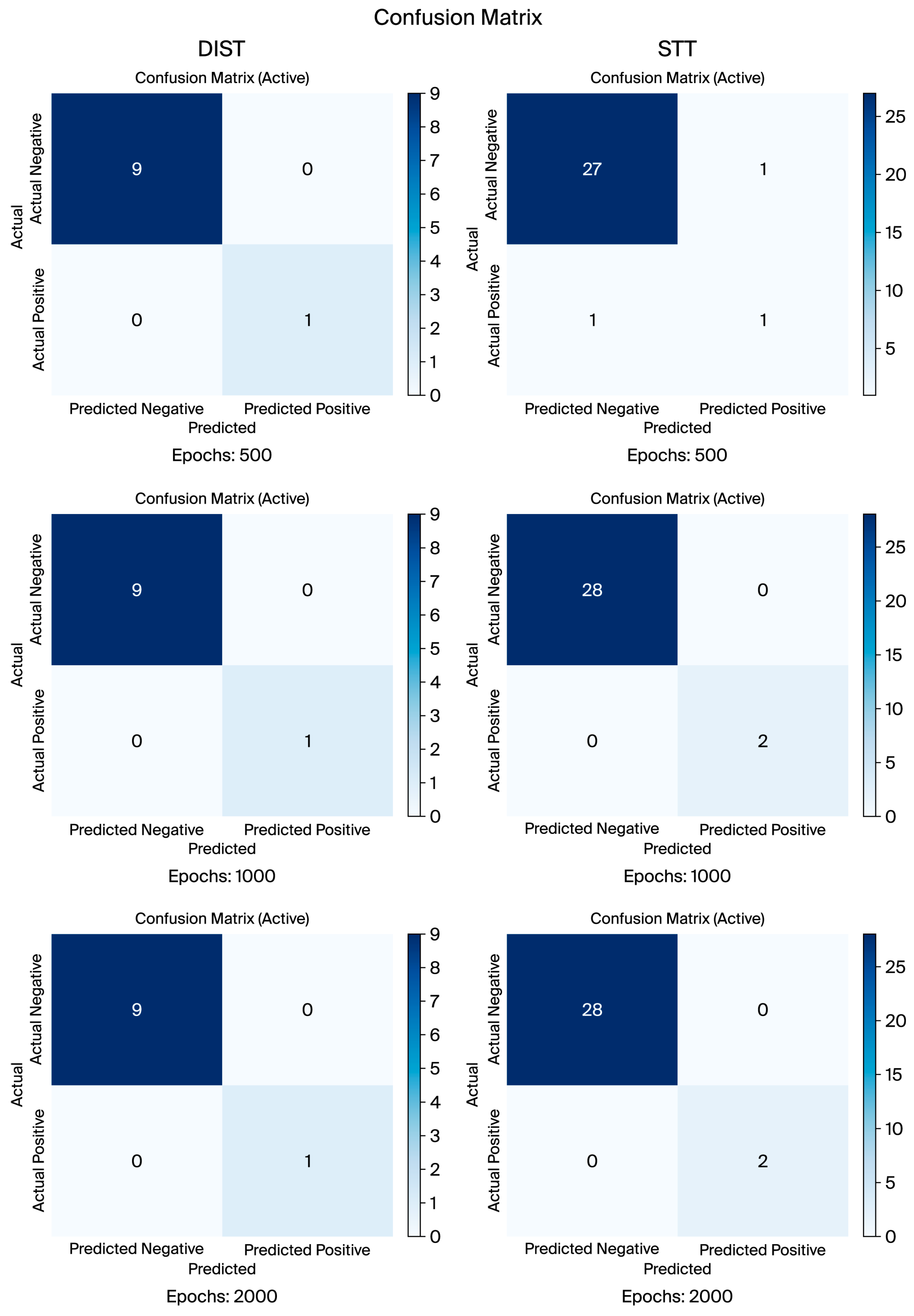 Table 7 provides a quantitative comparison of the training performance of STT and DIST over 500, 1000, and 2000 epochs. It indicates that the STT model experiences a notable drop in accuracy at 2000 epochs, while the DIST model maintains consistent performance. The results show that STT performs well at 500 and 1000 epochs but exhibits a significant drop at 2000 epochs, likely due to overfitting or weight divergence. On the other hand, DIST maintains high performance across all epochs, suggesting better generalization and stability.