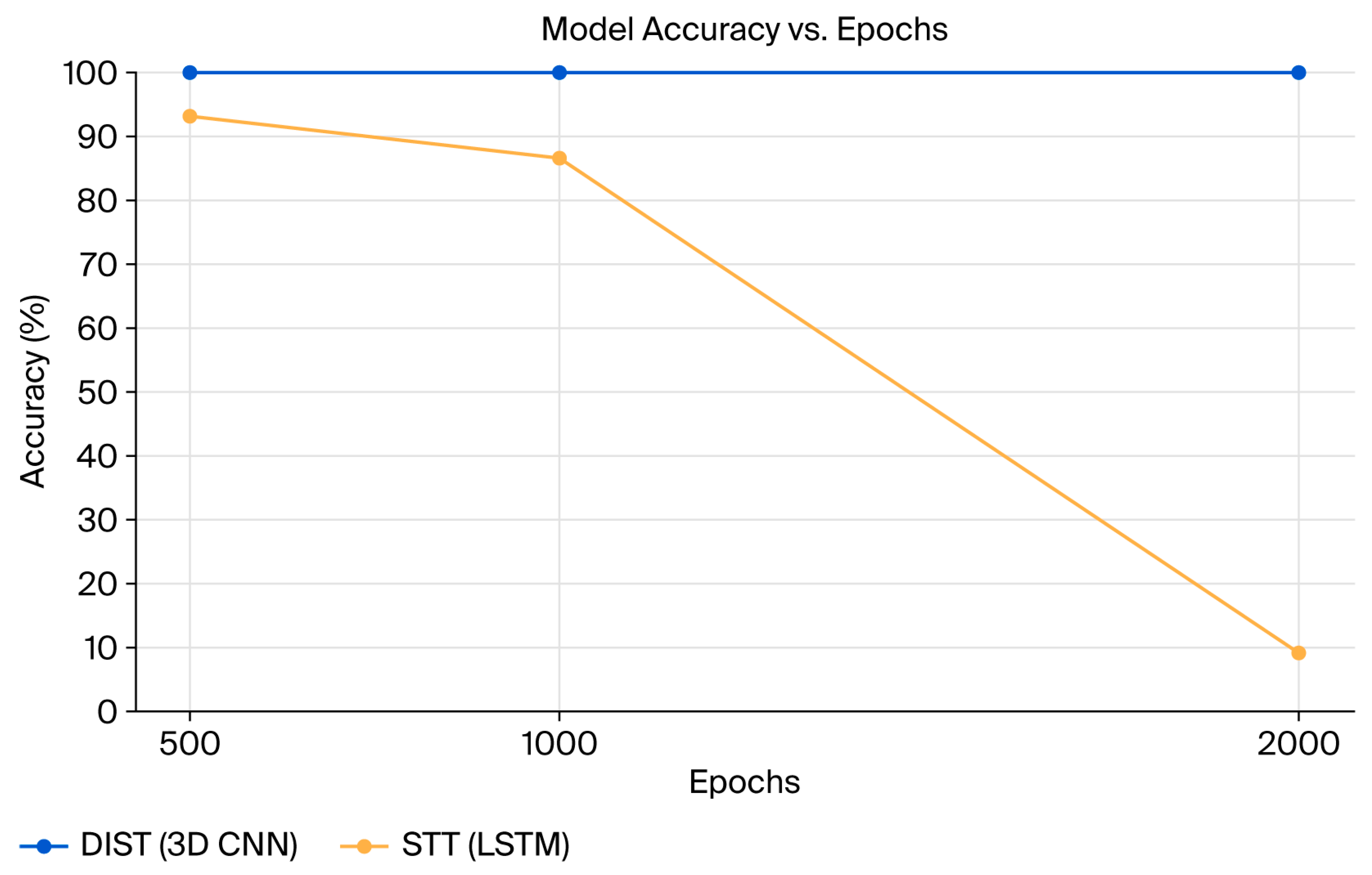 The STT system (LSTM-based) performed well on static gestures at 500–1000 epochs but failed at 2000 epochs due to overfitting and recurrent weight divergence. In contrast, the DIST system (3D CNN-based) achieved stable, perfect performance across all epochs, effectively capturing the temporal motion in dynamic gestures. This difference underscores the importance of using an LSTM for static signs and a 3D CNN for dynamic signs, supporting the hybrid architecture of the proposed IoT-enabled Sign-to-Text framework.