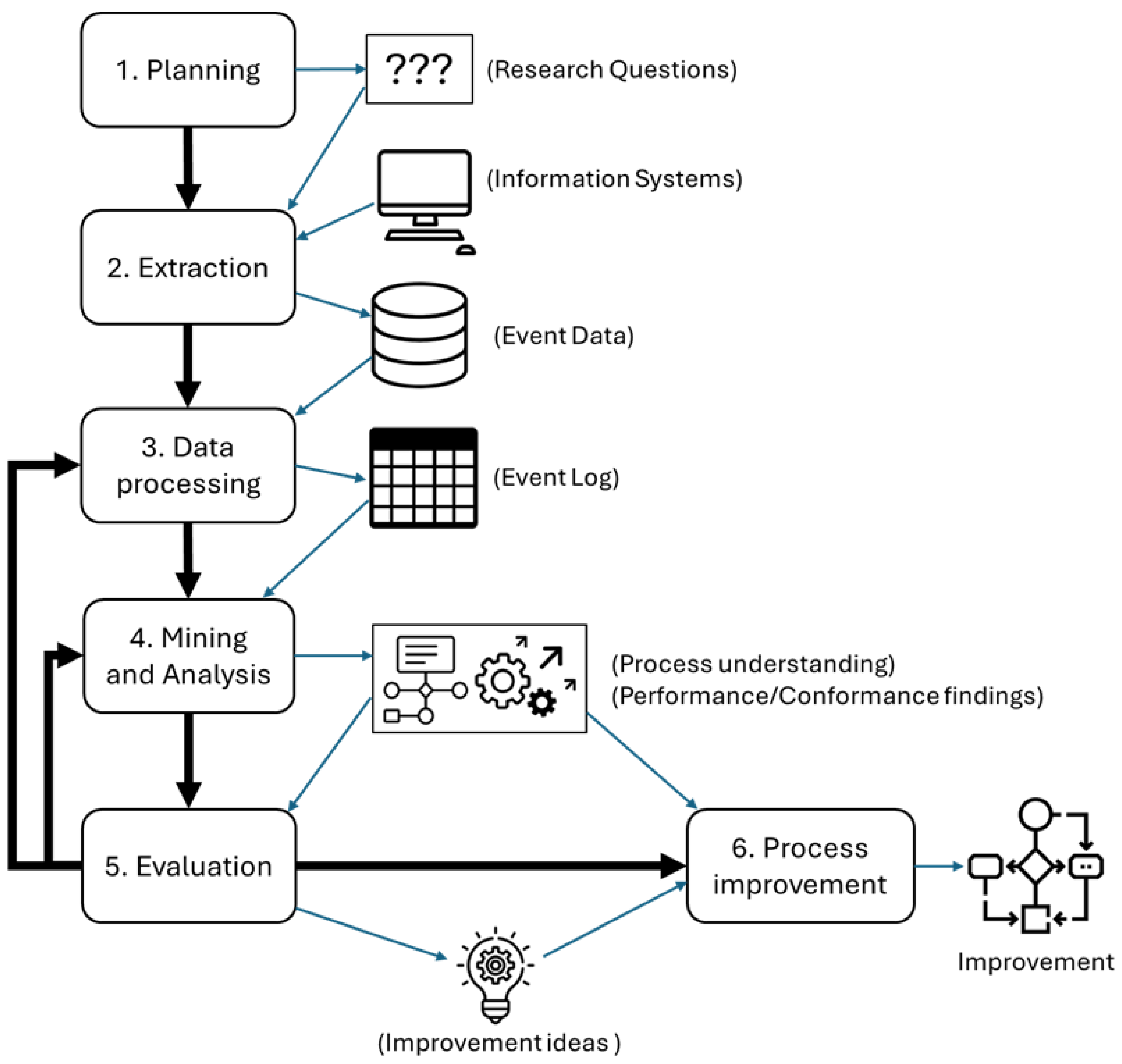 22]. This methodology comprises six steps: planning, extraction, data processing, mining and analysis, evaluation, and process improvement (