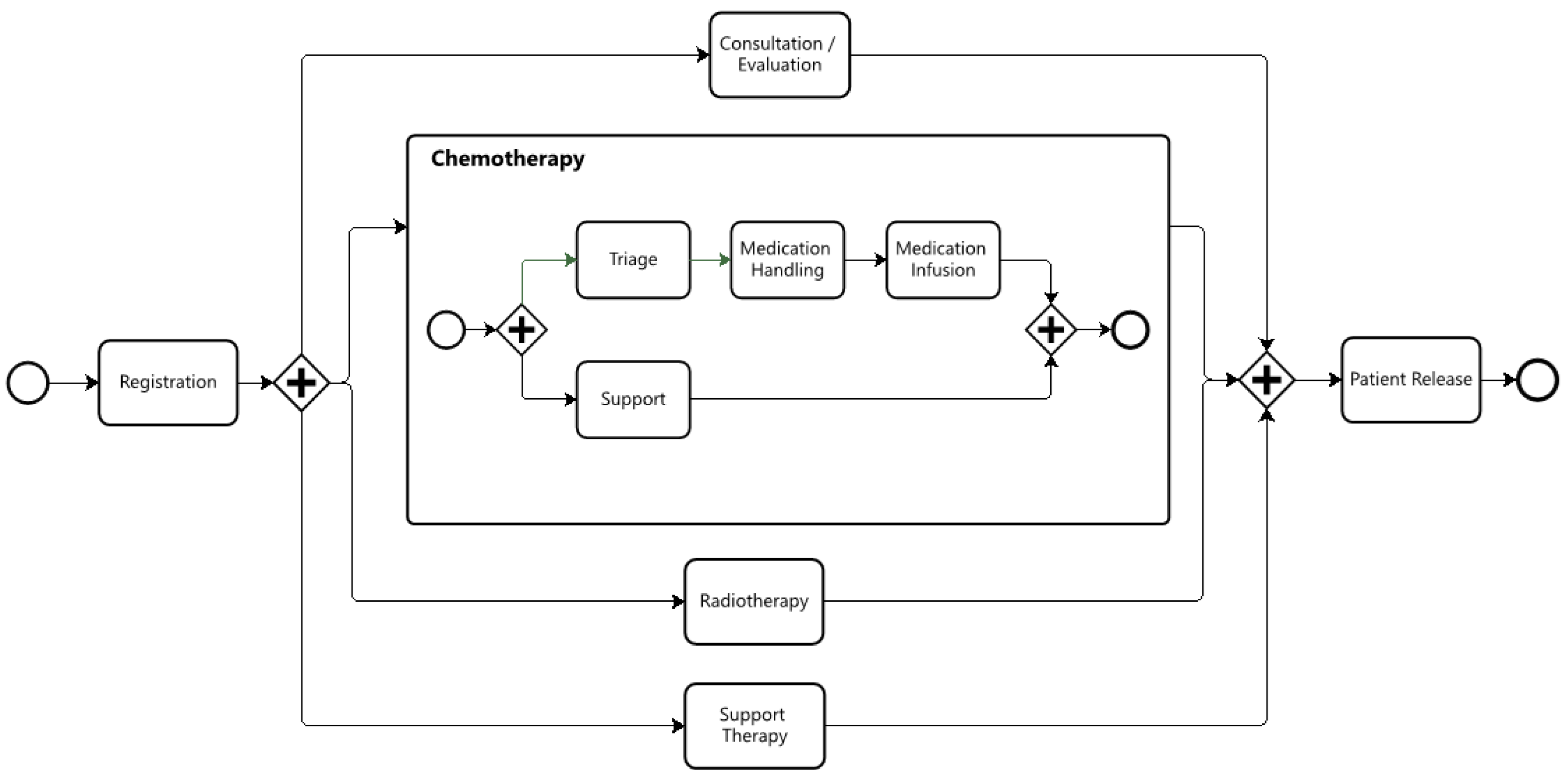 Another distinction lies in scope. Iachecen et al. limit their analysis to lung cancer, while our study addresses multiple cancer types. Additionally, the data source differs significantly. The event log used by Iachecen et al. is derived from a sample of beneficiaries of a health insurance provider and primarily consists of data used for billing and reimbursement. A positive aspect of this dataset is that it covers multiple healthcare providers and diverse patient demographics—unlike ours, which is limited to a single cancer center. However, such administrative data may not capture all events necessary for constructing a detailed view of the patient flow, which is critical for our study’ purposes. For instance, chemotherapy involves a series of preliminary steps (such as triage, preparing, and dispensing the medication, etc.) that are likely not included in the records submitted to the insurer.