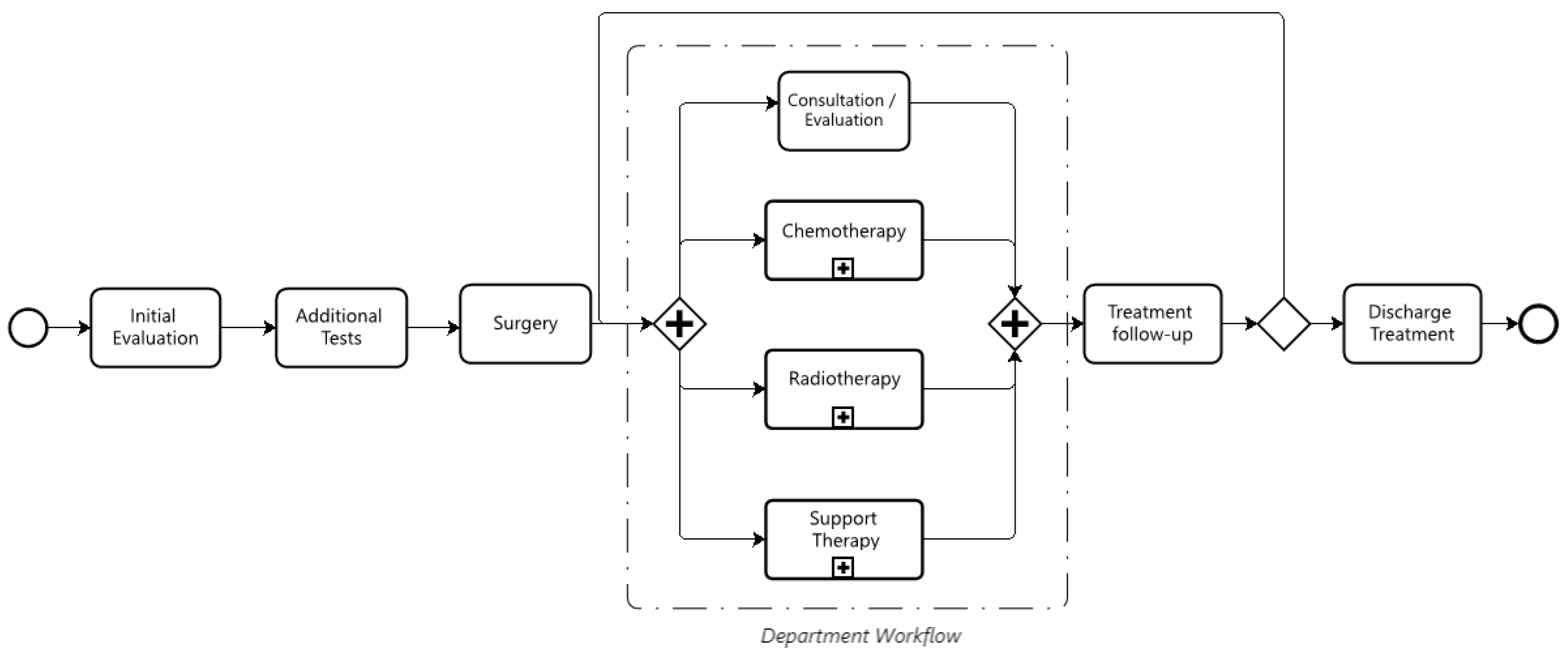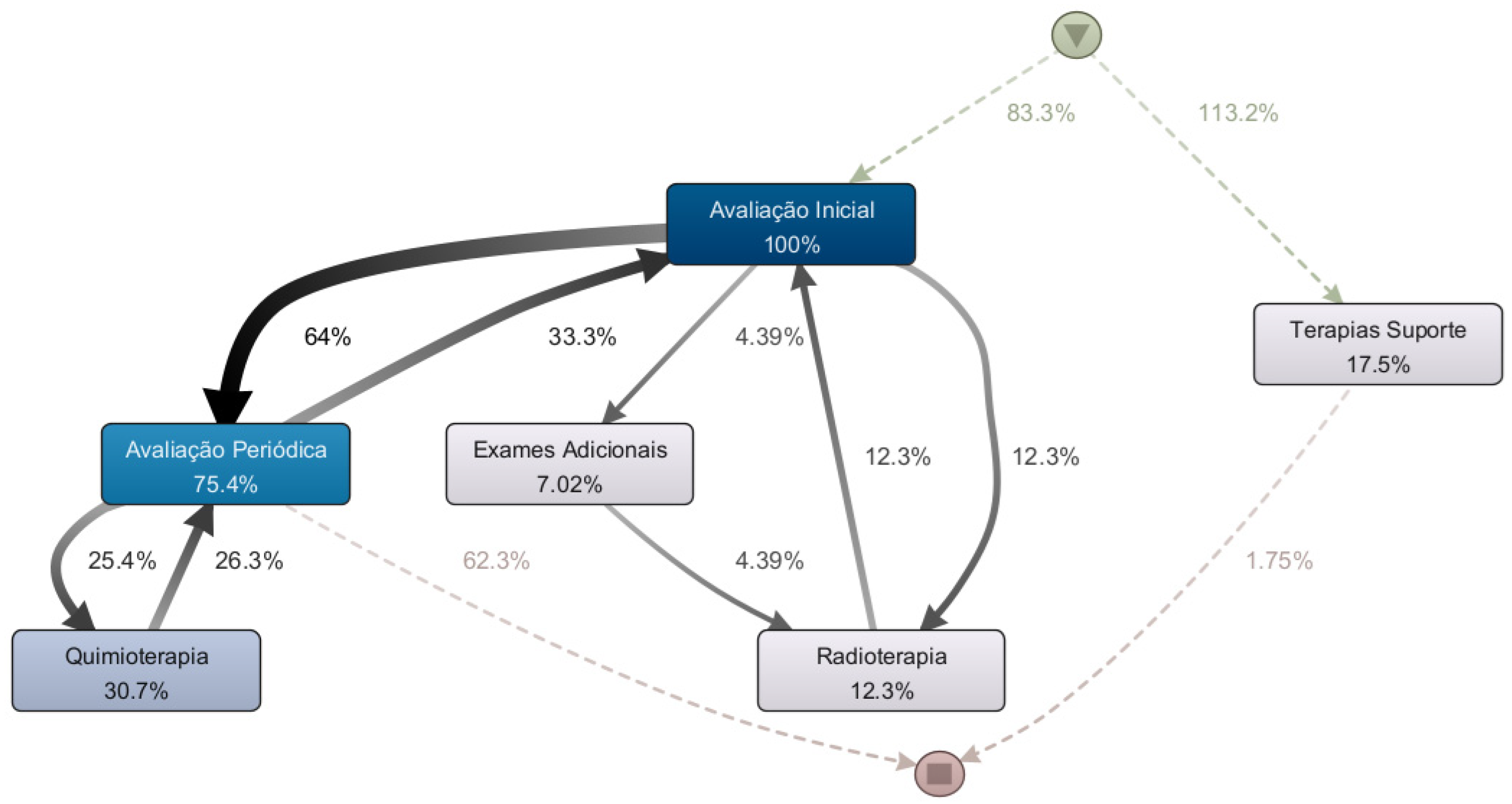 Through process discovery, the goal is to identify the pathways followed by patients during outpatient care (Department Workflow) and throughout the entire treatment journey (Treatment Workflow). This analysis aims to map critical paths and key process variants. Critical paths warrant particular attention because they are more susceptible to delays and bottlenecks. Therefore, identifying and analyzing these critical paths can provide support for the adoption of monitoring policies and tools, as well as for improving the clinic’s operational processes, making them more agile.