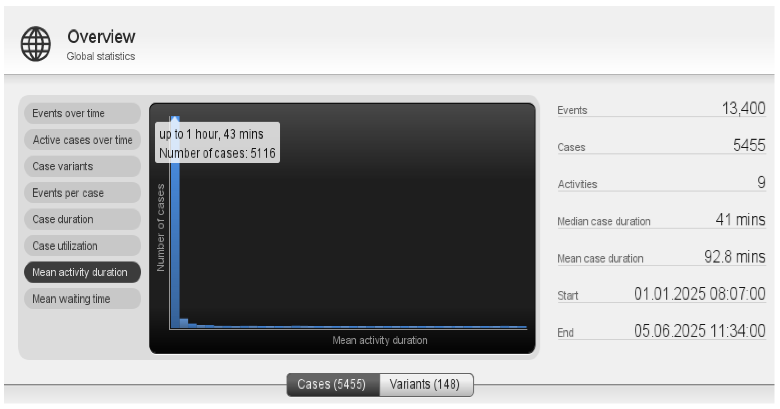 To address the research question “What is the average execution time of the process?”, we used the “Global Statistics” feature of the Fluxicon Disco tool (