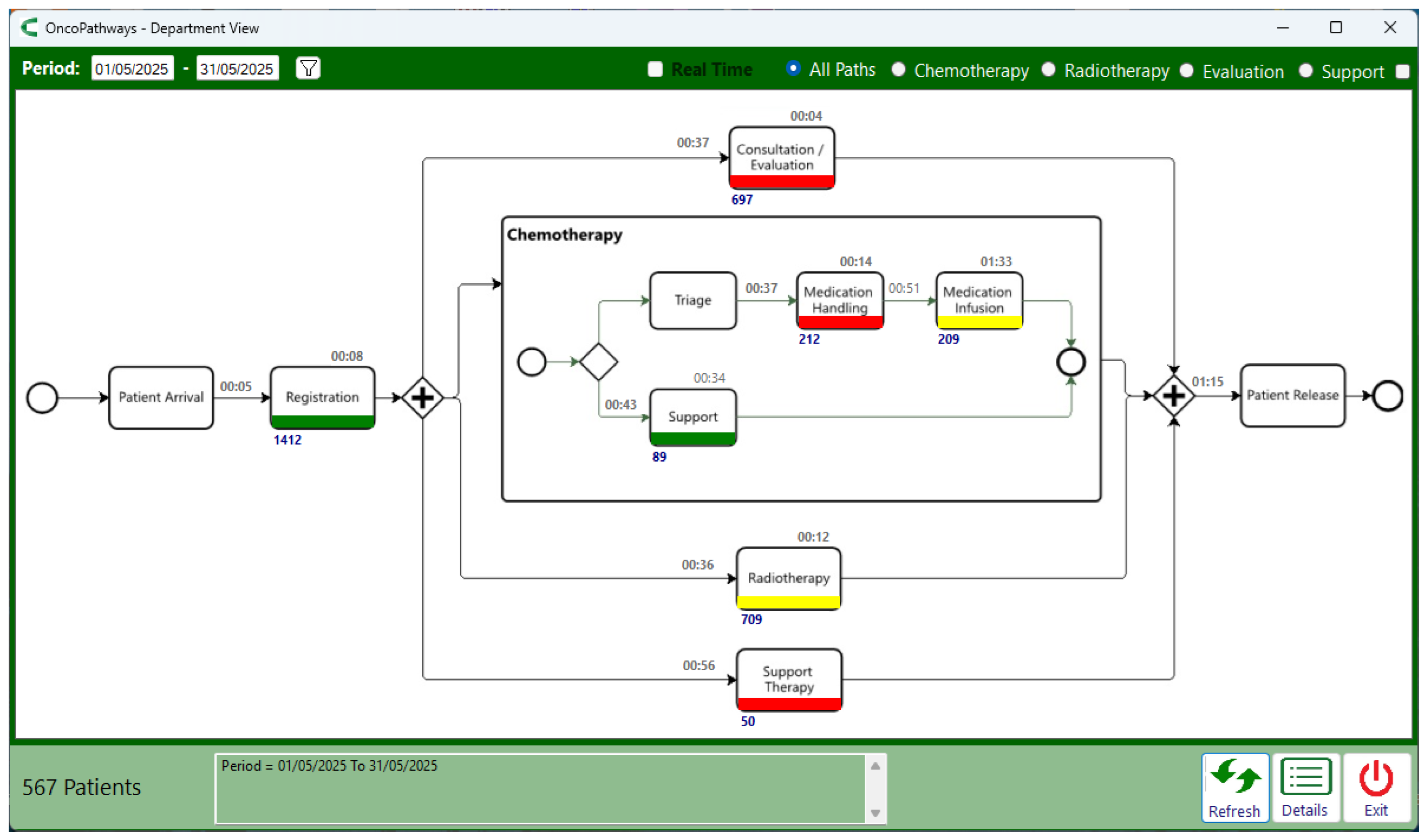 Figure 4 reveals the presence of several flow variants. For example, when analyzing the standard chemotherapy administration sequence (Registration → Medication Handling → Medication Infusion)—shown in