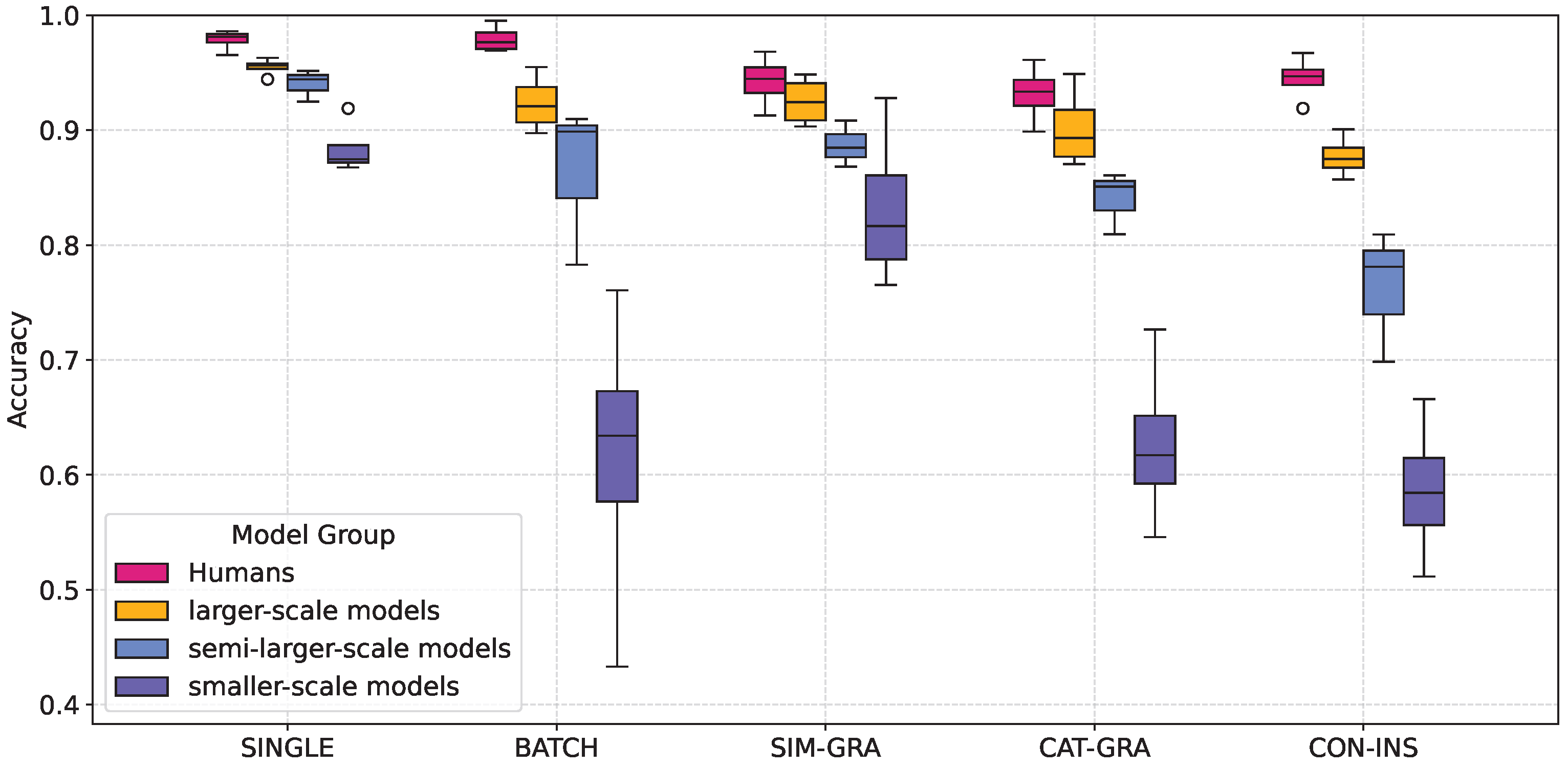 - Large-scale models perform relatively well, but there remains a significant accuracy gap between them and humans.