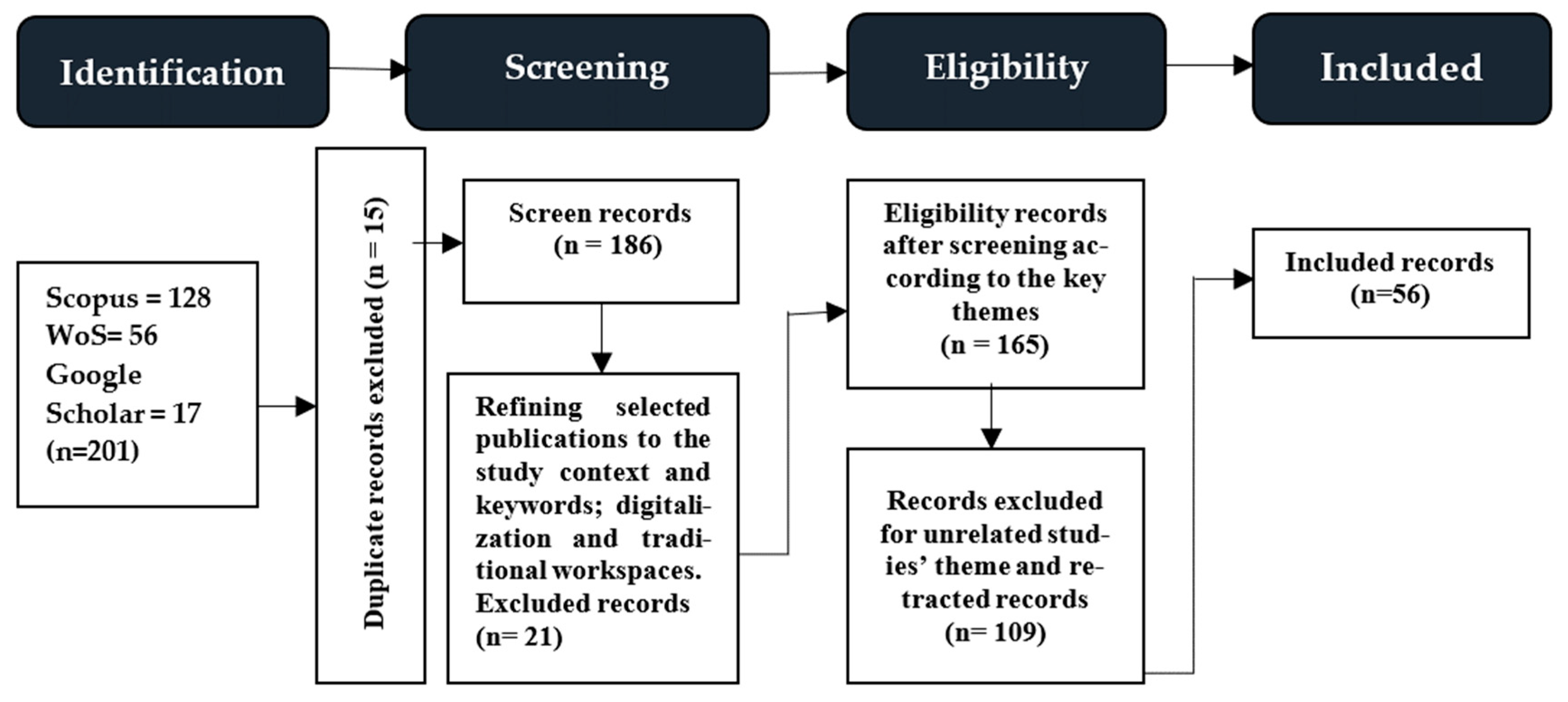 | [56] | Digital workspace theory | Digital work ecosystems | Conceptual fragmentation | Identifies future research paths. | Global; conceptual review | 2022 |